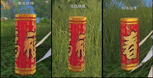 在小娜娜、小钱钱、小岩岩3支舞狮队伍身后,分别有花团锦簇、繁花似锦、似水流年三种烟花,用火折子点燃方可完成任务获得奖励。